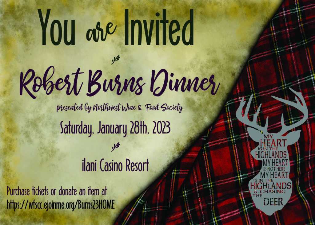 We are excited to announce that our beloved Robert Burns Dinner is back after a four year hiatus. Please join us at ilani Casino Resort January 28, 2023 for a beautiful dinner and great wine.